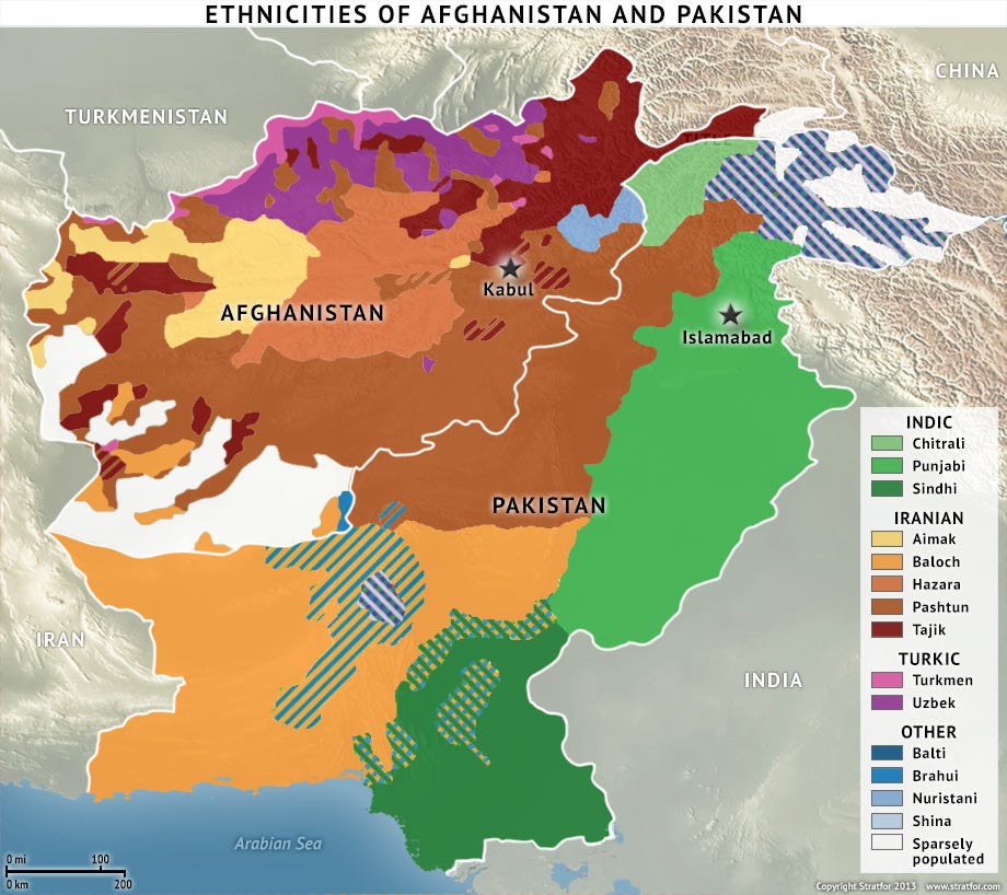 This map of ethnic groups in the two countries is really helpful. See the border? See the same color of brown on either side there in the central area? That line is the Durand Delusion, a brilliant British move, running a line right through what ought to be called Pushtunistan. Not only are they ethnically the same people, it’s common for herders to winter at lower altitude in Pakistan, then scoot across the line for high country grazing in the summer. What could possibly go wrong here?