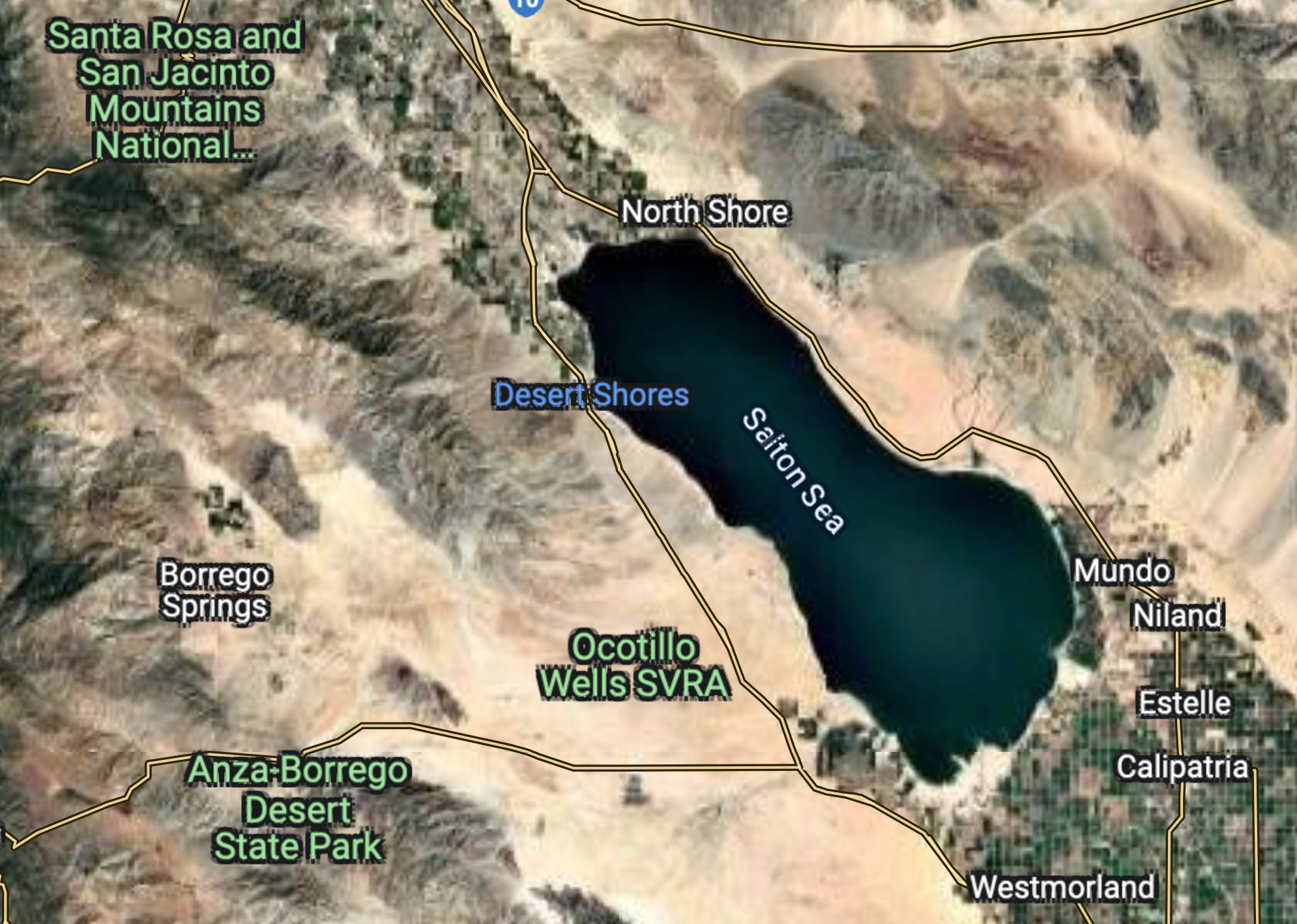 Well, here it is, as seen from orbit - the Salton Sea. Periodic Colorado river flooding in the late 19th and early 20th centuries escaped control efforts, creating the body of water we have today. A decade ago I spent a summer in the area, curing myself of the urge to live in the desert. The heat in this part of the world feels to me like a frantic wild animal trying to claw its way into the house.