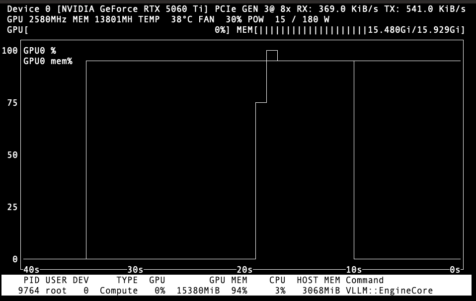 If your config is right, you’ll see this with nvtop on the virtual machine. vLLM grabs all the memory right at the start, the other rise and fall there is the CPU, which runs a couple of bursts as the system initializes itself.
