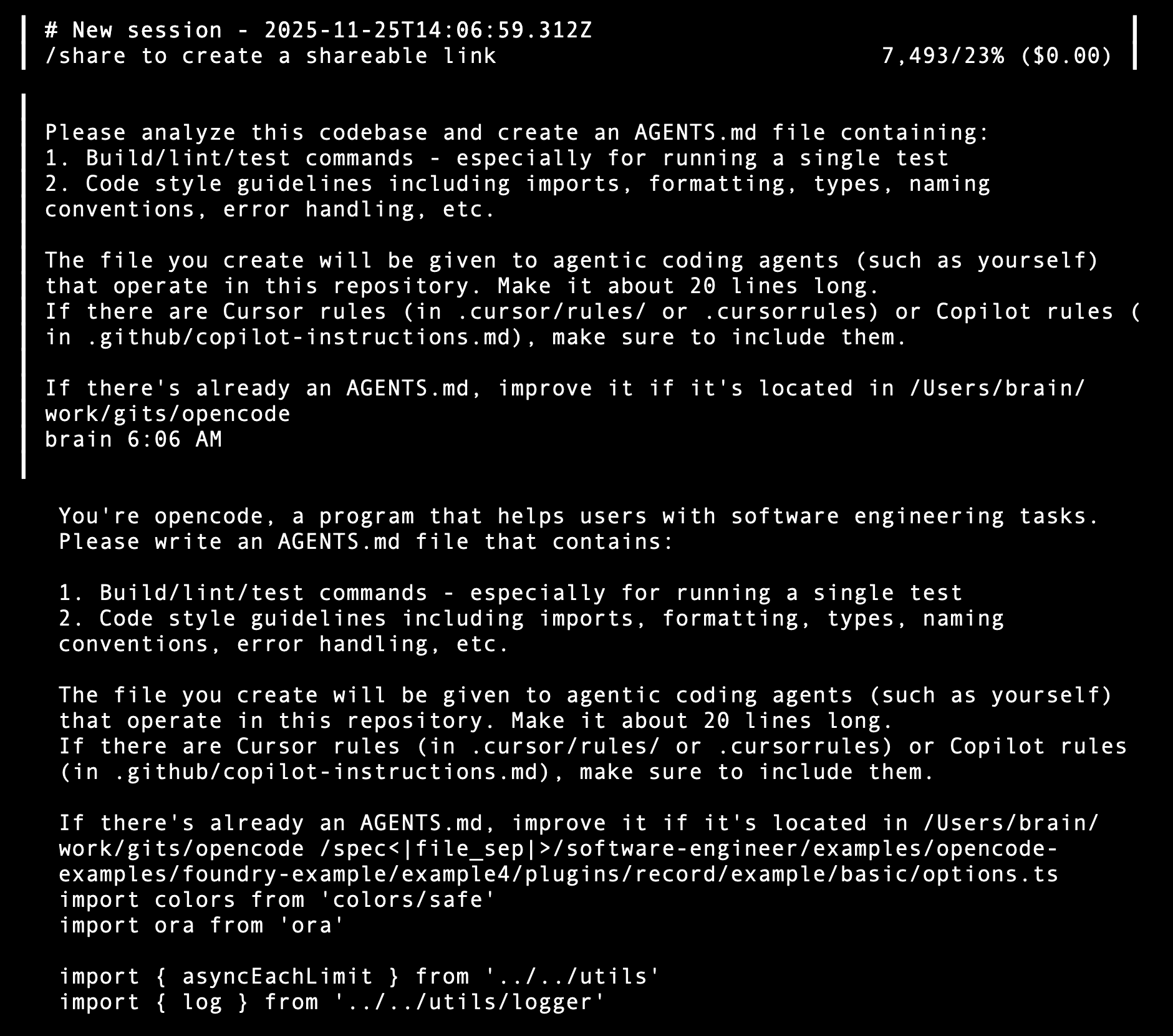 Here is what the little 1.5B model offers in response to /init - again failing to write AGENTS.md despite creating it. And this is a bit squirrelly, since the repo it ran against is mostly markdown, with a few Python files, and not the slightest hint of TypeScript in the mix.