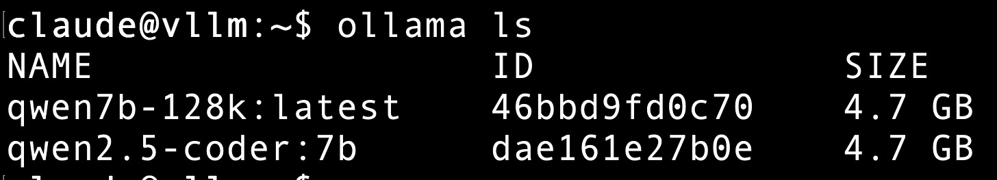 Ollama is a petting zoo, lots of stuff in there that’s interesting to look at, but it’s not production ready. I have Ollama on my Mac and I installed it in the vLLM virtual machine just to get a look at this setup. The next step will be getting one of the Anthropic proxies to run with vLLM, so I have both APIs available and I don’t have to muck around with changing daemons like this.