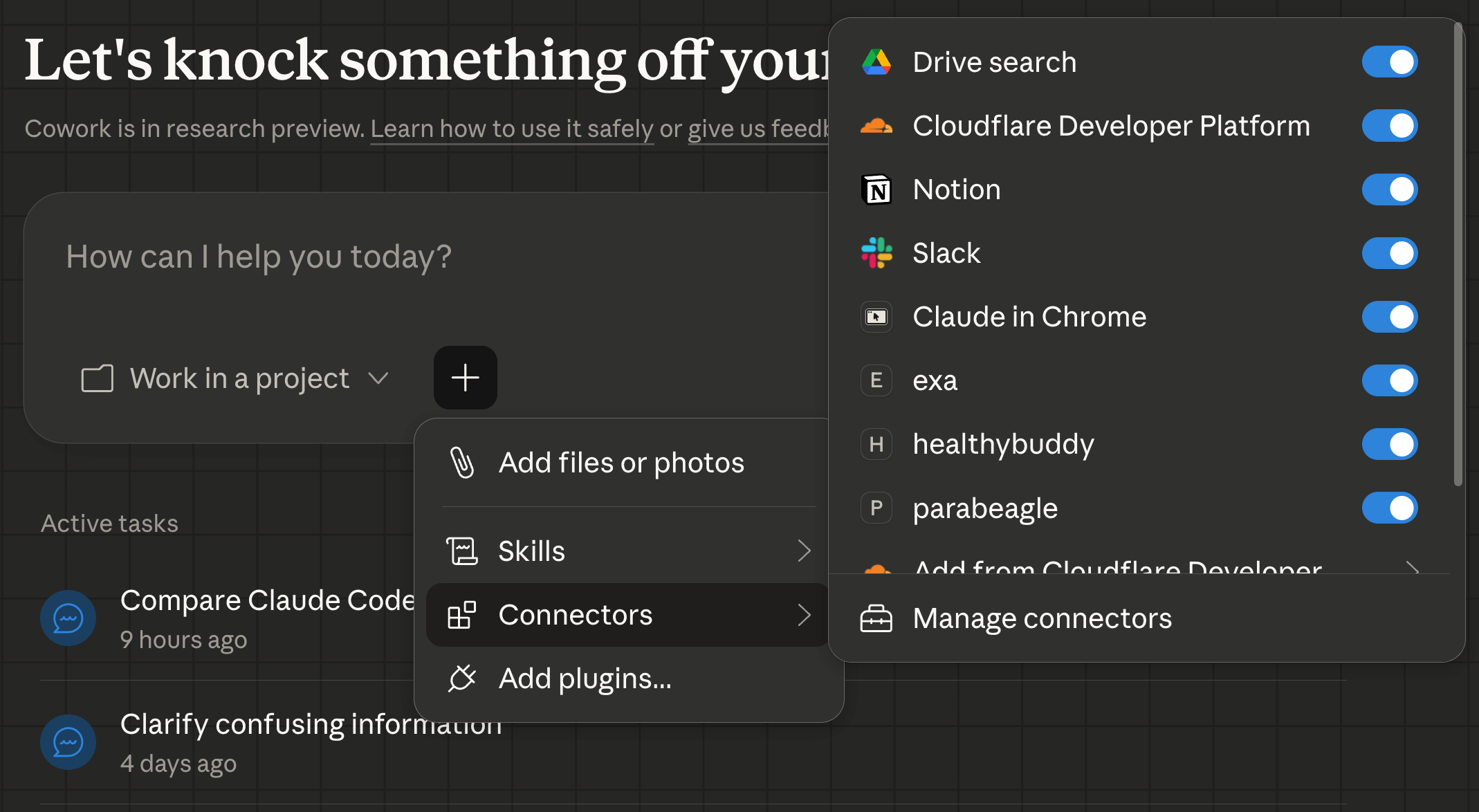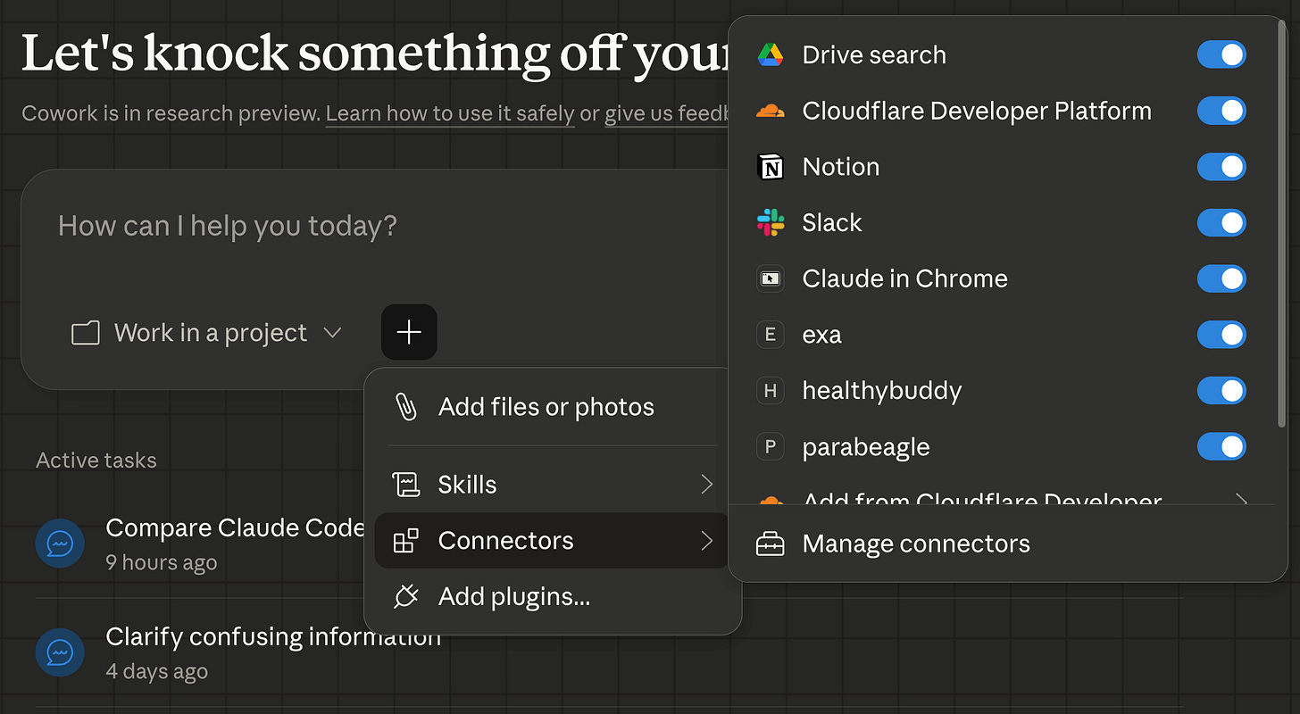 Once you have a Project in Cowork it’s not just your files, you can add specific skills, a set of connectors, or the curiously named “plugins”. Here’s a peek into what runs on my system - Notion+Slack for business stuff, Claude in Chrome and Exa are for research and testing, and both of my software projects (Healthy Buddy and Parabeagle) come with MCP servers.