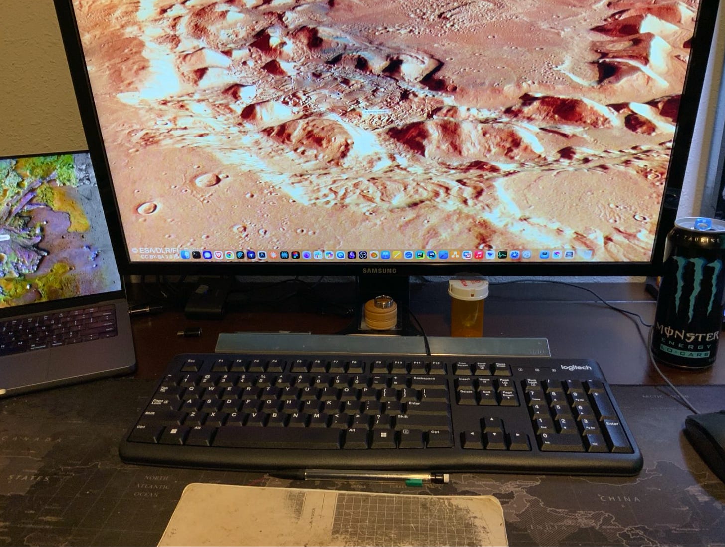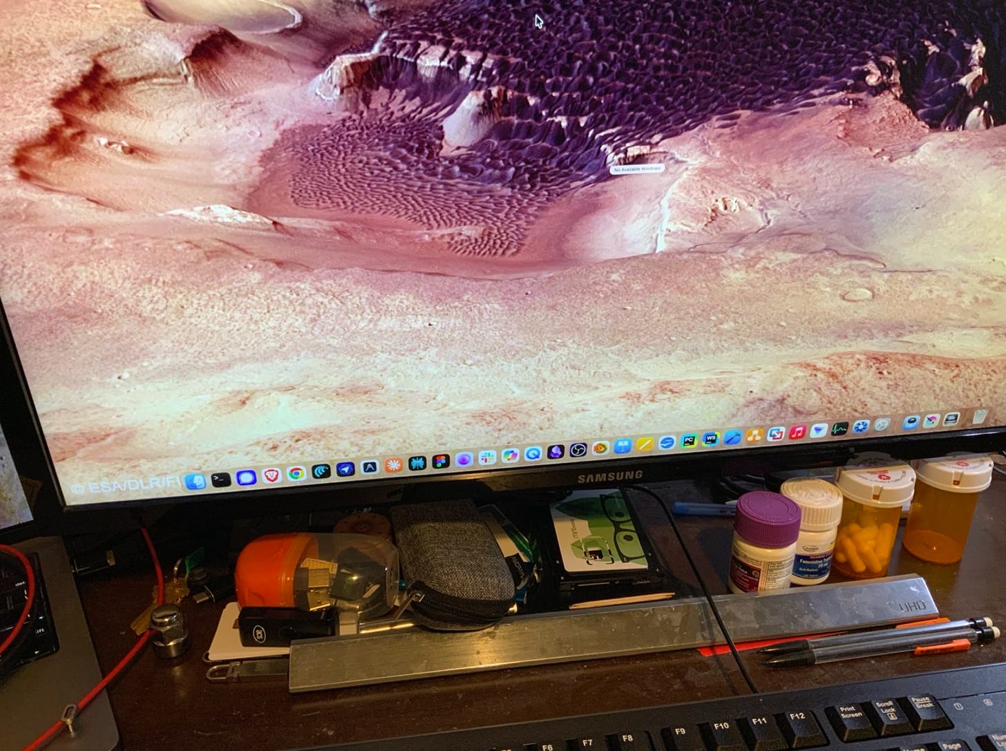 This feels much better. I didn’t know the name of this particular bit of Mars that’s on my second desktop, so I asked Claude, and it’s quite apropos - that’s Aram Chaos. I found my decoder ring (center) and the pill bottle contains the mortal remains of my old friend, Ms. Mantis.