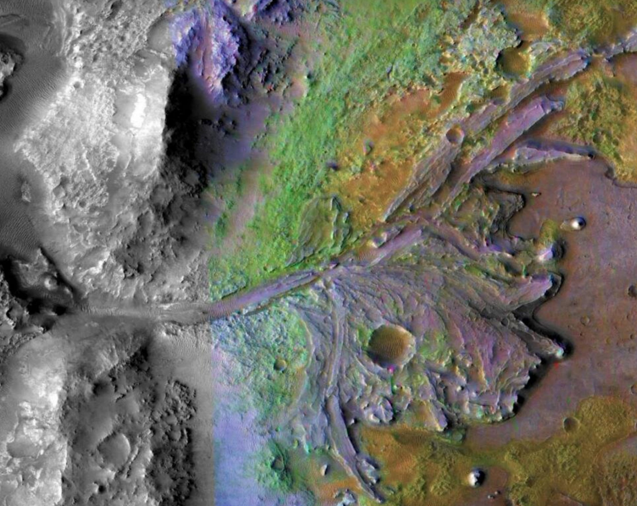These minerals were one reason Jezero was chosen; carbonates preserve biosignatures.Purple / Lavender → Phyllosilicates (clays)