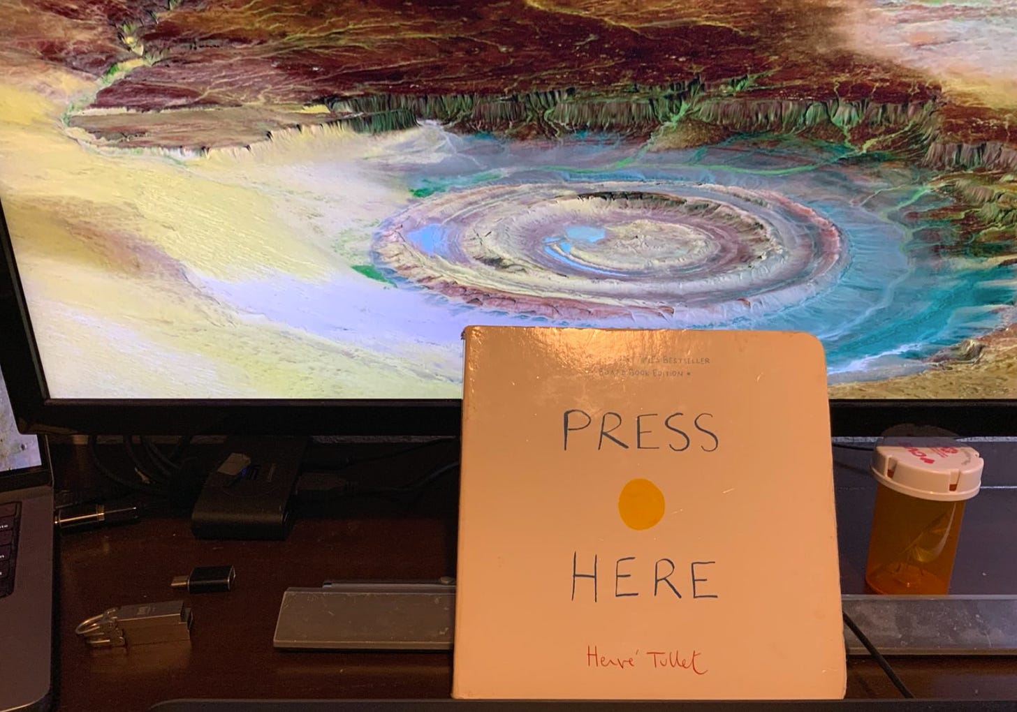 Here’s an object that caught my eye last week on the train. There was no child in the vicinity, and yet I found a children’s book, Press Here, just sitting in the green disabled seats by the door. The big concentric button looking thing above it is NOT a crater, that’s the Eye of Richat, a hydrothermal feature in the Sahara.