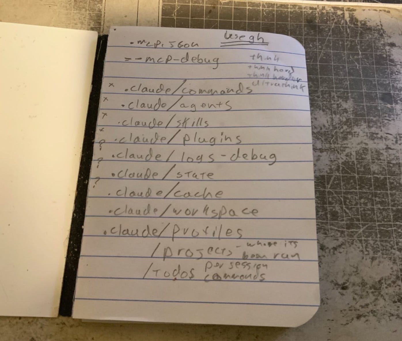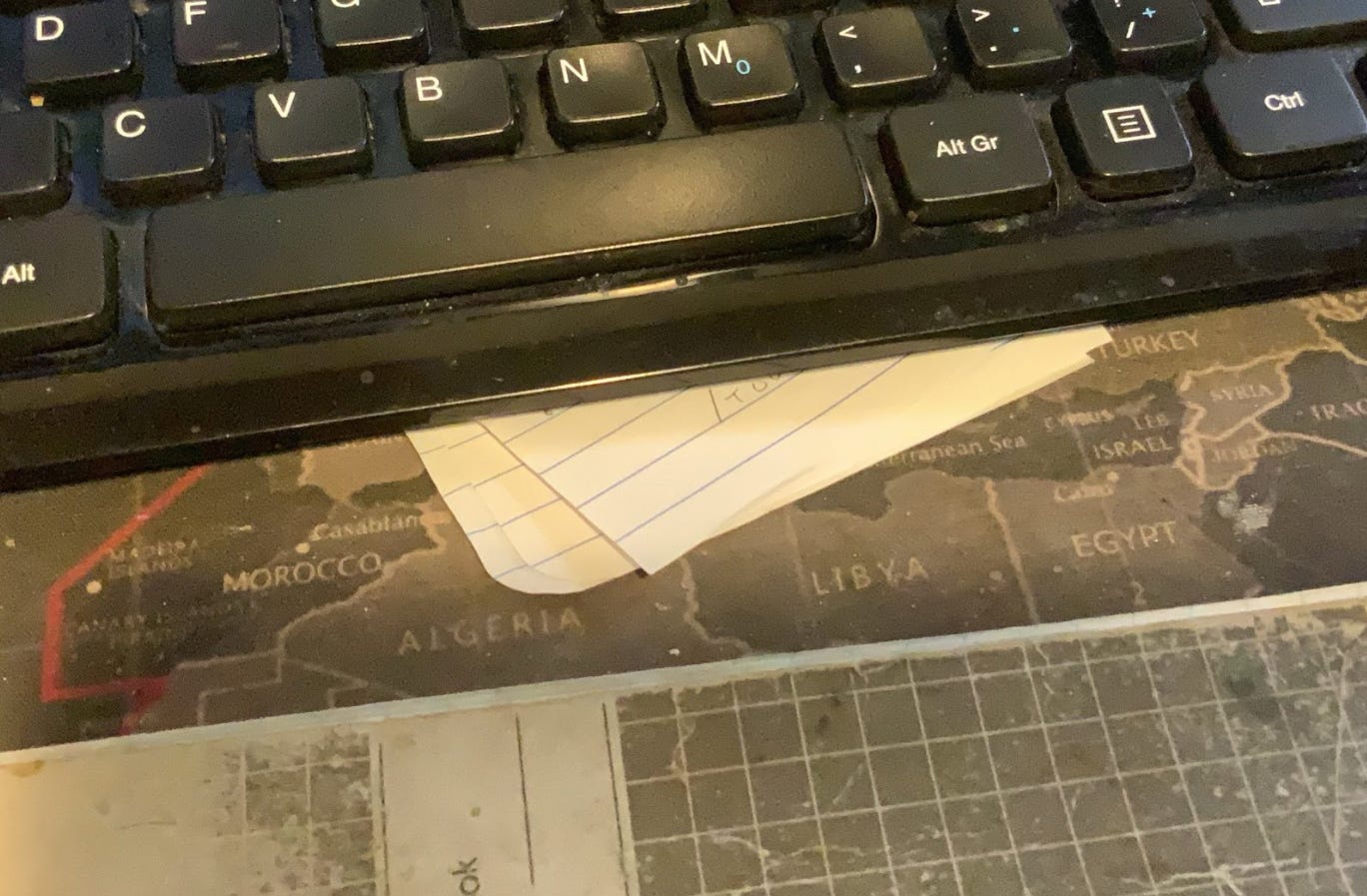 This is the latest advance in my daily activity. There is a connection between seeing something and writing it down by hand that is not activated by typing. The ratty full sized notebook that is sometimes a mouse pad has been joined by this little one with a binding that lets me easily remove pages. This is short term memory in physical form.