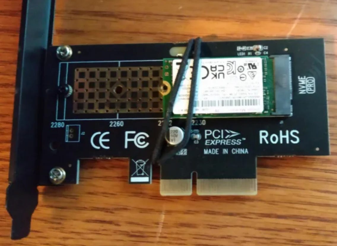 This stuff had worked in September, I tried the keyboard and mouse using a random consumer SSD just to be sure they worked and that was fine. I hunted up that drive, ran the install … and NO PROBLEM. I had been trying to use a 1.6TB LSI PCIe flash drive for storage and Qubes was having none of that. I also experimented with my ghetto fabulous PCIe NVMe cache drives. The ponytail band keeps the little card in place but without a heat sink they hit 60C if I run them hard.