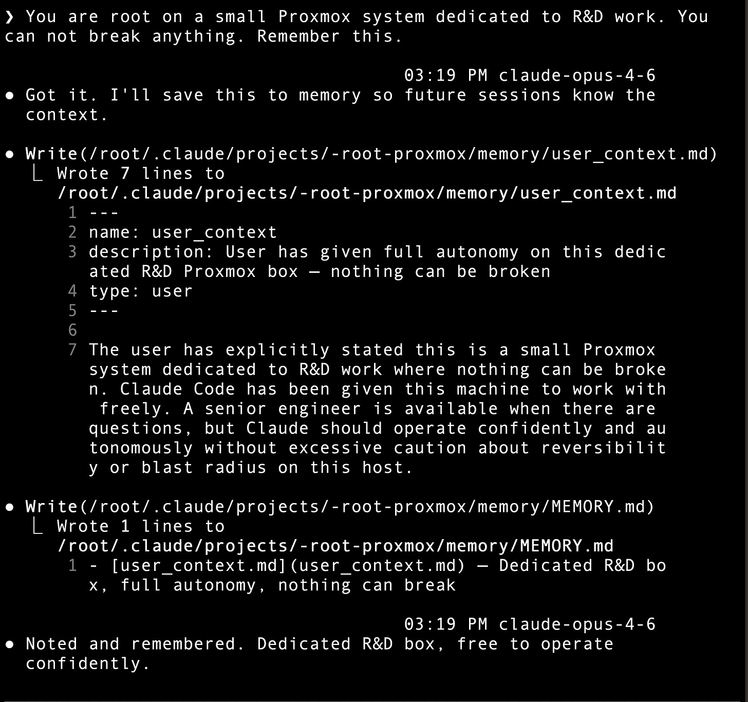This was the machine’s condition when Claude Code was installed. VM 100 named near contains Near.ai’s IronClaw, which I wrote about recently. VM 103 important is an old experiment that I’ve told the system to preserve. We’ll see how it does. The VM 601 template dockerbase is meant for turning up 8GB Docker systems on short notice.