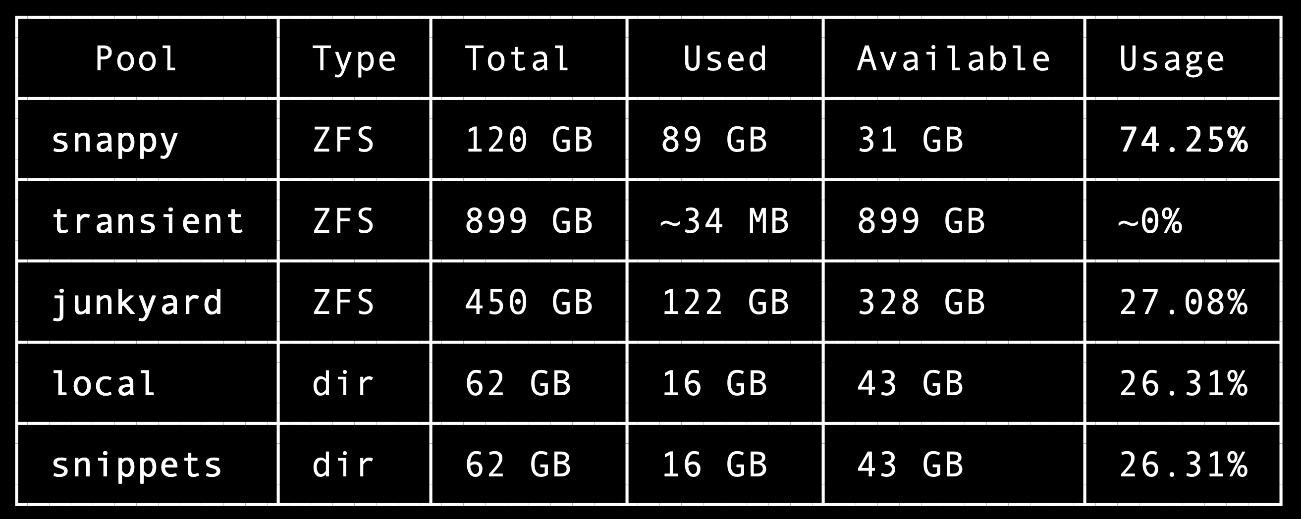 These are the storage pools as I built them prior to installed Claude Code. Snappy is a slice of the NVMe drive for whatever has to be really fast, transient is the curiously named 1TB of long term storage, and junkyard is the mirrored pair of 500GB.