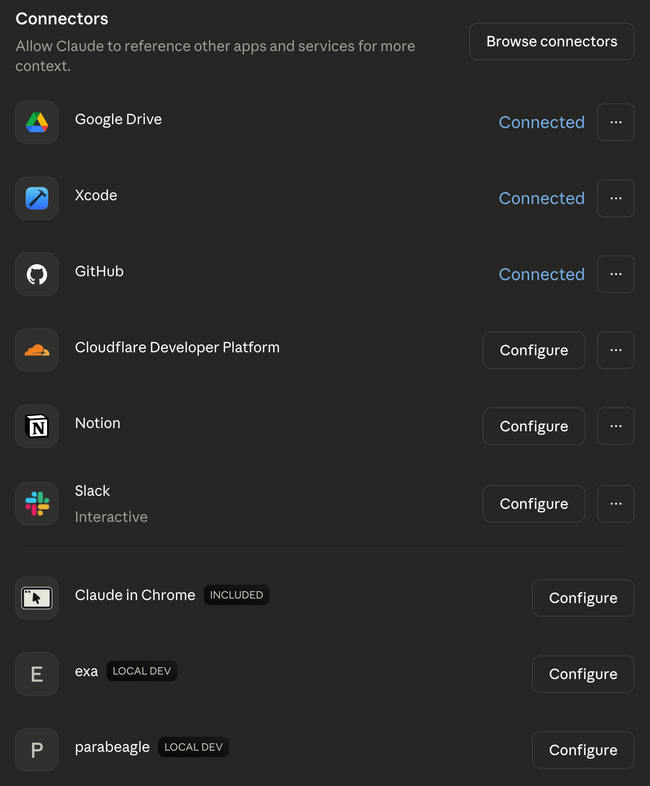 You can see Claude in Chrome there at the bottom. Exa is a search utility, Parabeagle is my local document indexing tool. Google Drive is a dumb file storage thing I dislike, Notion is a much smoother alternative, and Slack is for work chat. I can have Cowork read a Slack channel to get the details on a task, write it up in its sandbox so I can review it, and then push it to Notion so the others can see it.