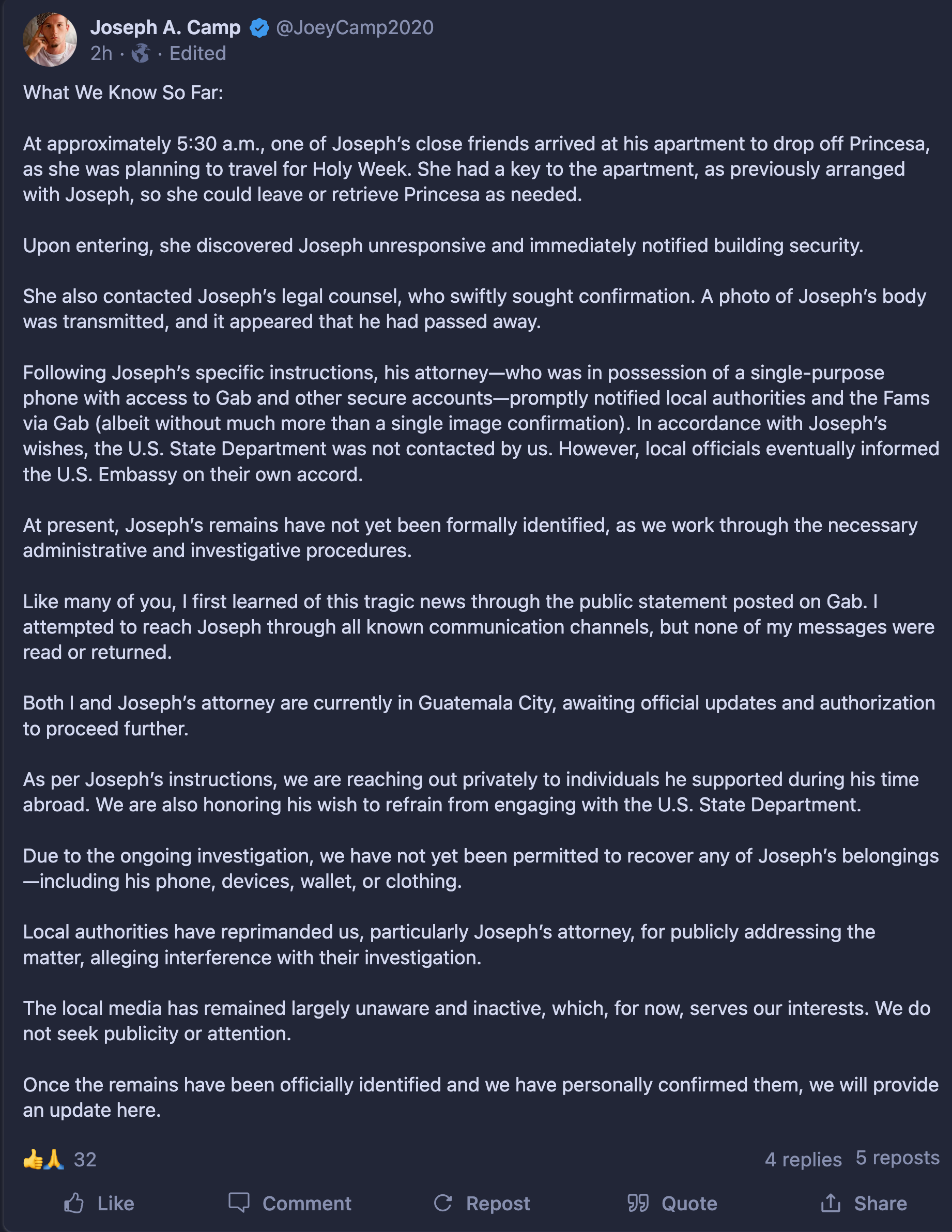 The activity on his Gab account today seems to indicate that he has indeed died.