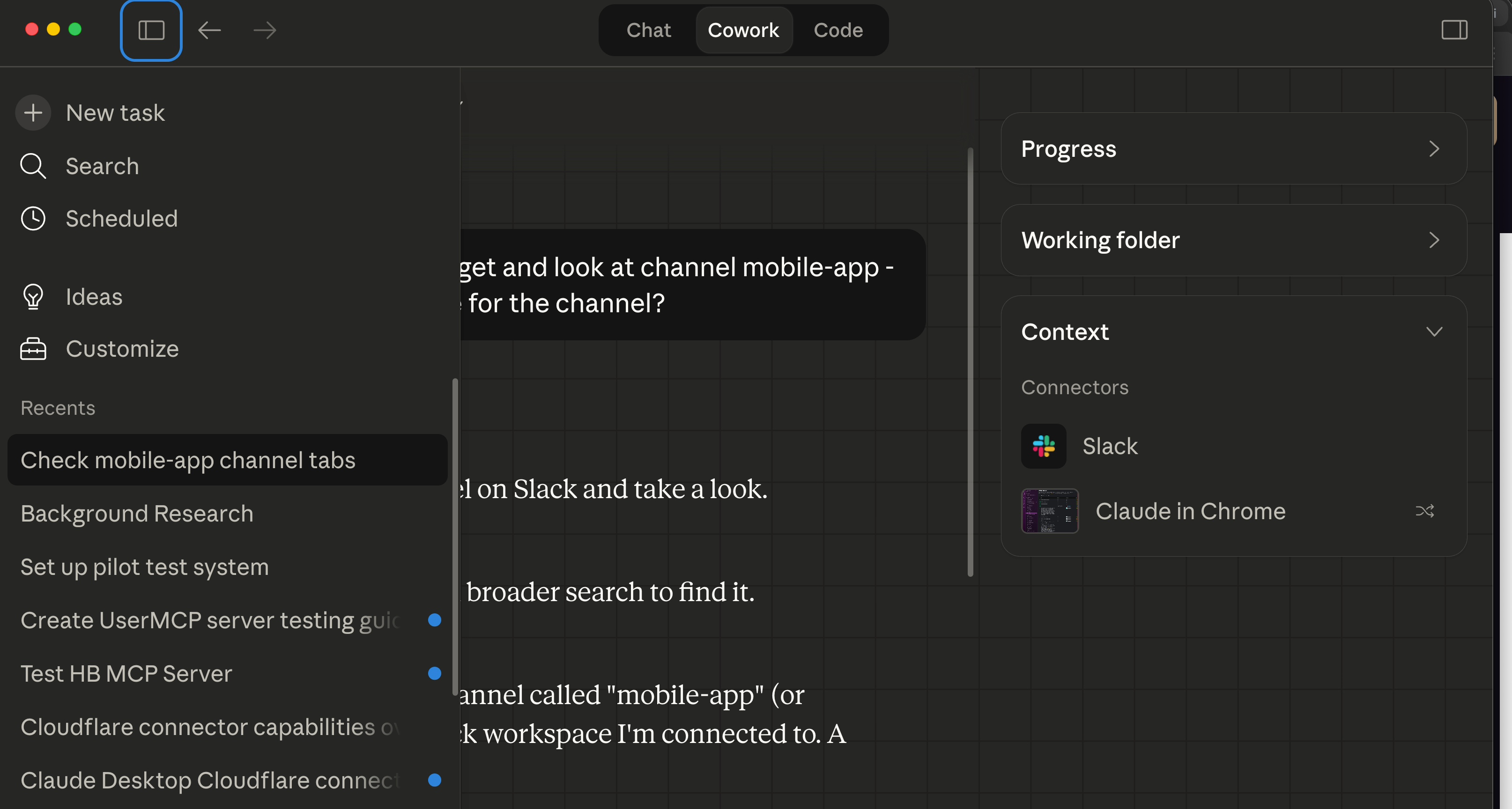 The left third of the screen are the conversations I’ve had with Cowork. The conversations you see are mostly server side development related. The right panel shows the resources being used in this Cowork session. The center is me talking with Claude, in this instance trying to get Cowork to read Slack templates - that’s me working on “TeamBrain”, the name for the “harness” we have for our “strike team” collective work.