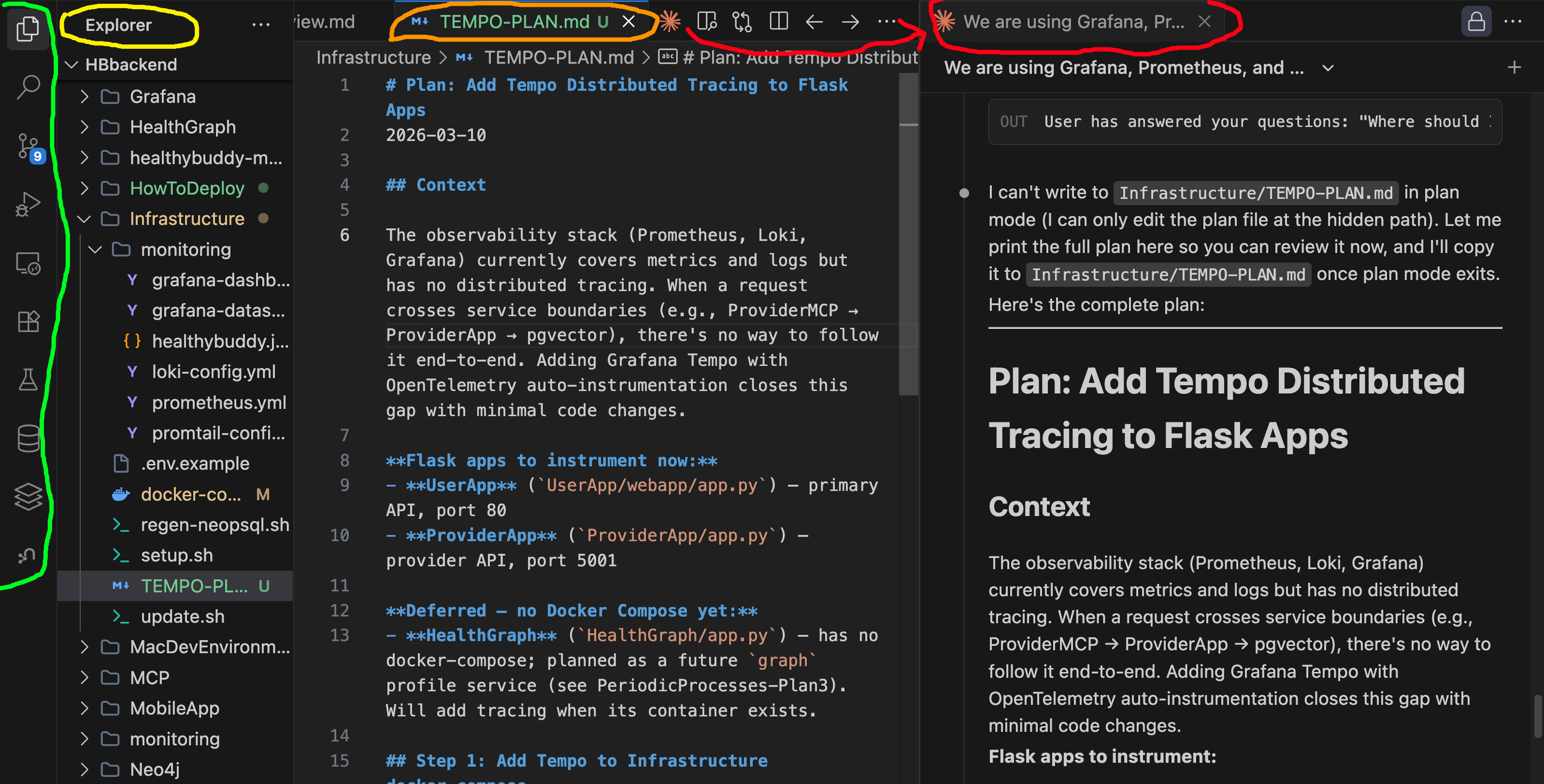 The orange circled TEMPO-PLAN.md is a file name and the orange Claude icon next to it launches the Claude Code extension. The far right pane “We are using Grafana” is me having a talk with CC about building our application stack monitoring.
