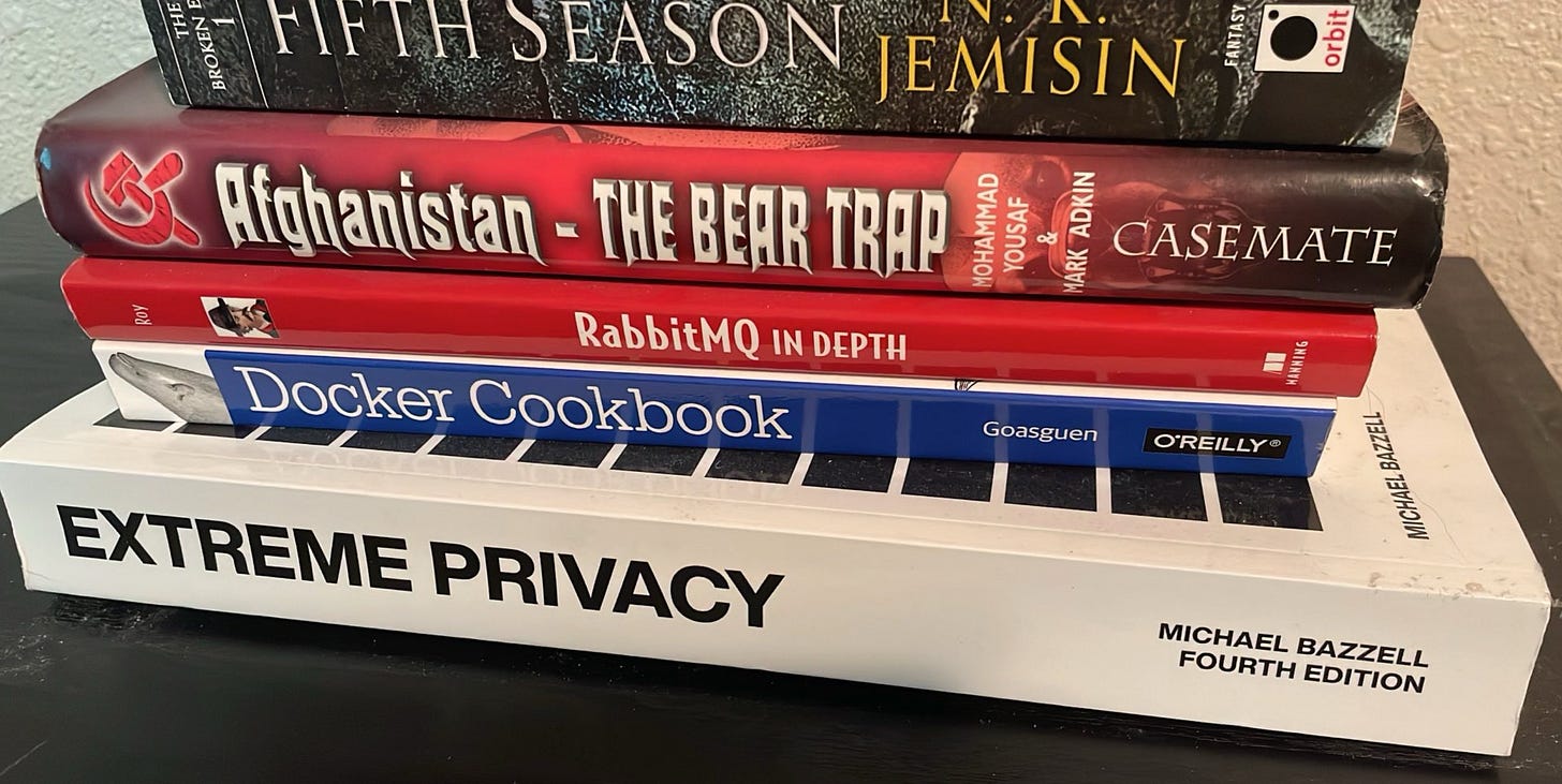 This is a stack of books on my night stand. Nobody ever went wrong reading Michael Bazzell.