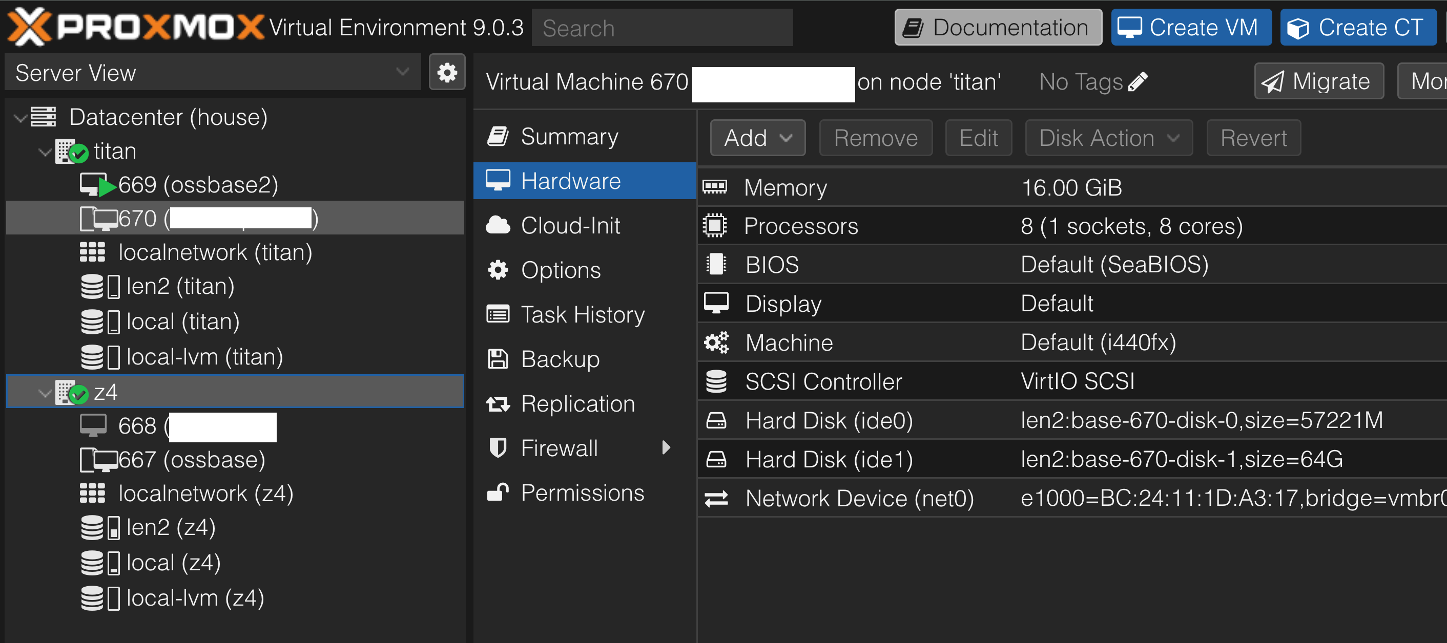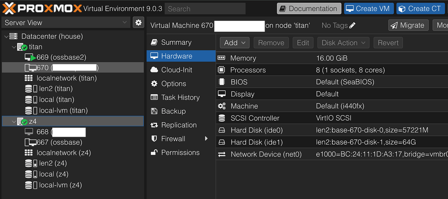 So here’s the final result, at least at the hardware level. Z4 workstation on the bottom, HP EliteDesk G5 on top. The two black things at the back are 1TB Western Digital Red NAS drives in USB enclosures. The little one is basically a miniature of the big one - they’re both Proxmox 9.0.3 systems now. Desk computer duties are assigned to the surviving Pi5, the other one went off an adventure with a new coworker.