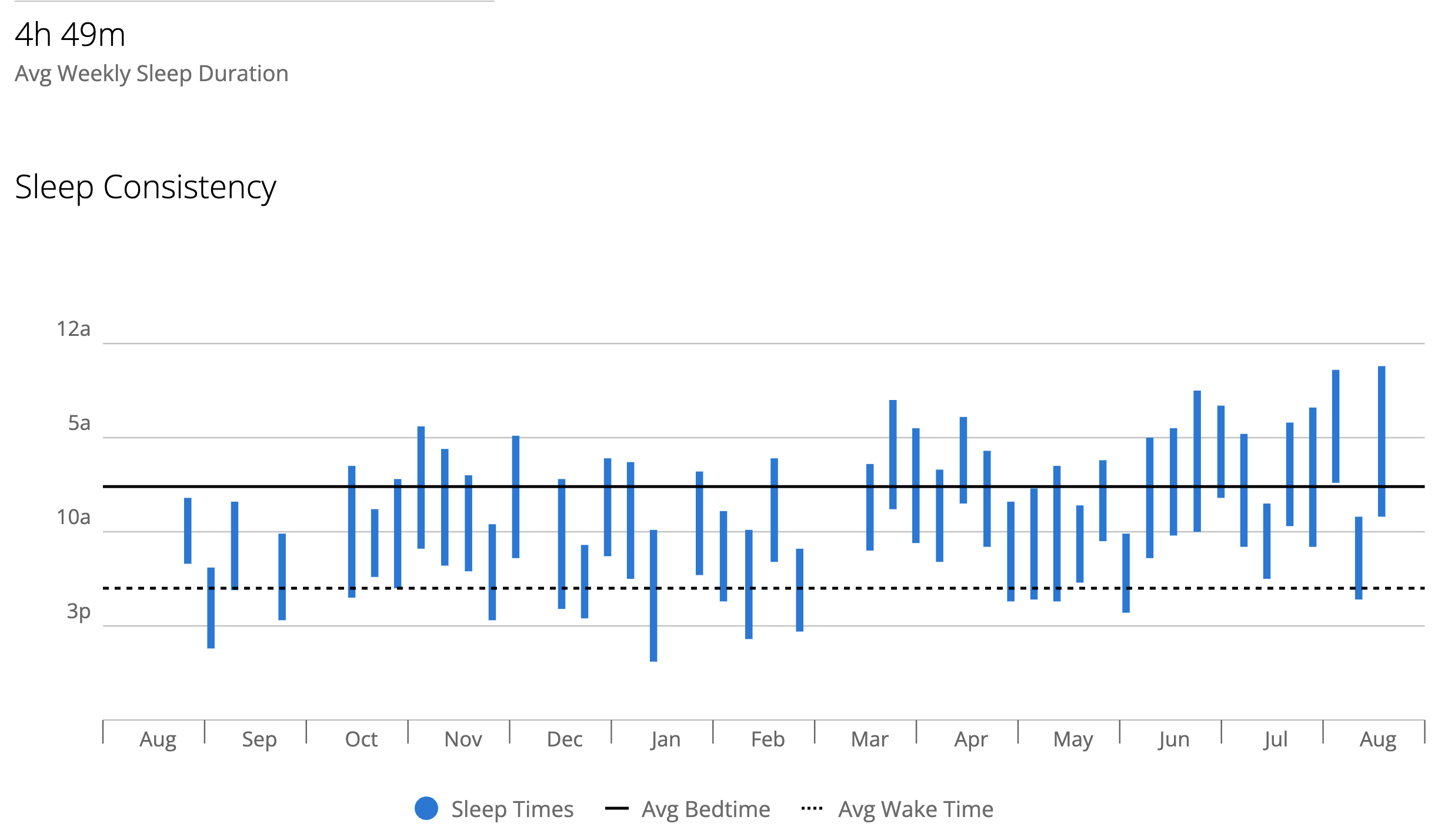 This was my sleep for the week ending August 17th. Keep in mind Garmin’s sleep detection algorithm will not catch restless sleep. The missing days are also around four hours and the second chart shows my average for the last twelve months is 4:49.