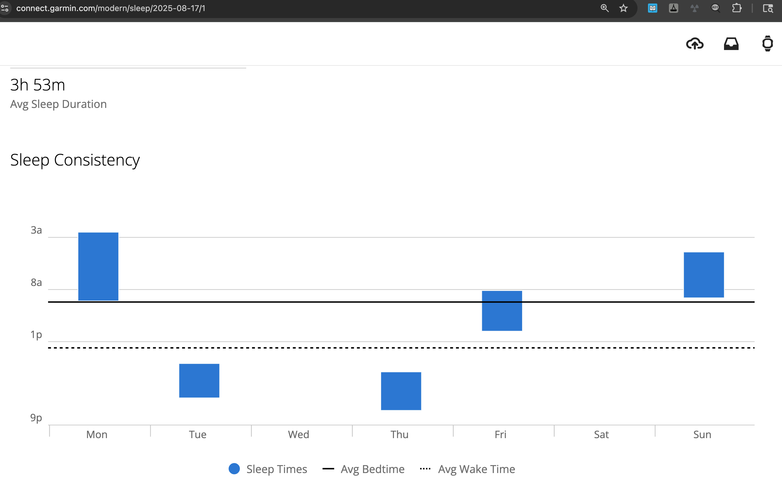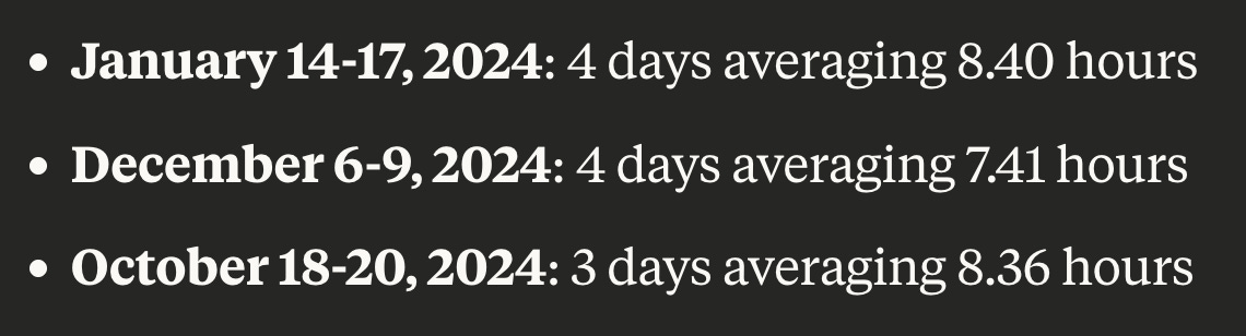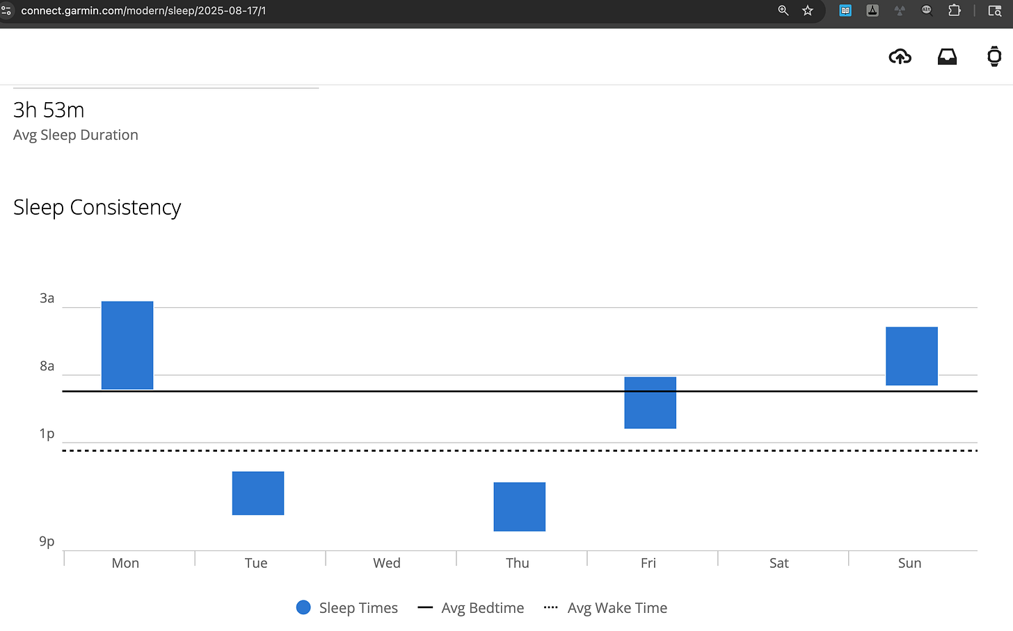 I have Garmin sleep records for the last eighteen months. Here are the times I managed to sleep seven or more hours three days in a row. The first two are a mystery, the last one is a response to a Pfizer COVID19 booster. Overall I averaged seven hours of sleep just three days a month.