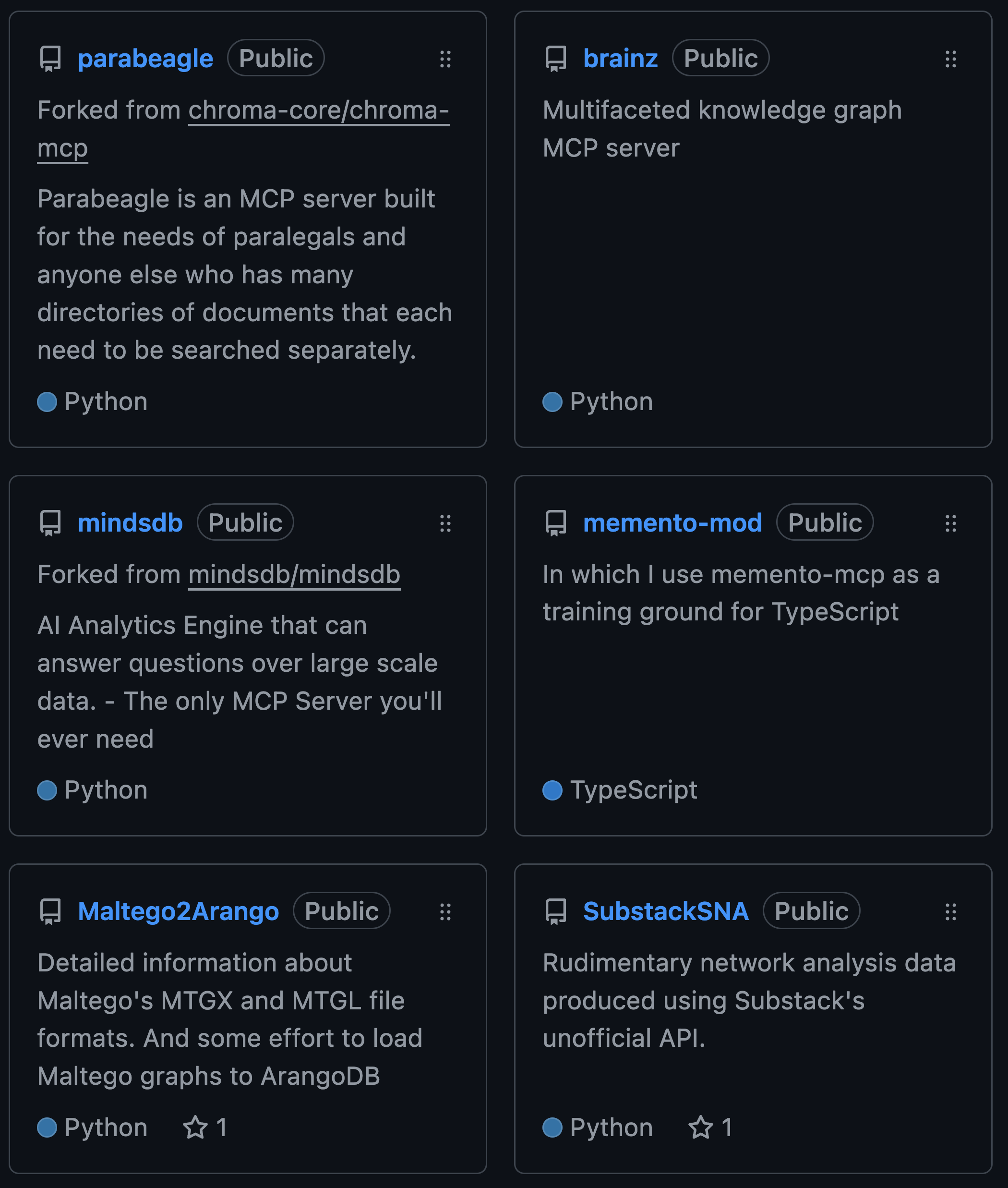 I’m keeping my fork of Memento-MCP up to date, since the author hasn’t touched it in six months, and memento-mod is there so I can learn TypeScript. Once I understand the particulars of that knowledge graph system, brainz will become a Python based MCP server that provides similar capabilities. It will likely follow the Parabeagle model, permitting users to switch between multiple graphs that do not overlap.