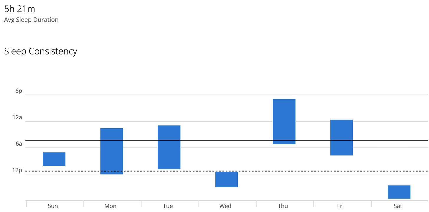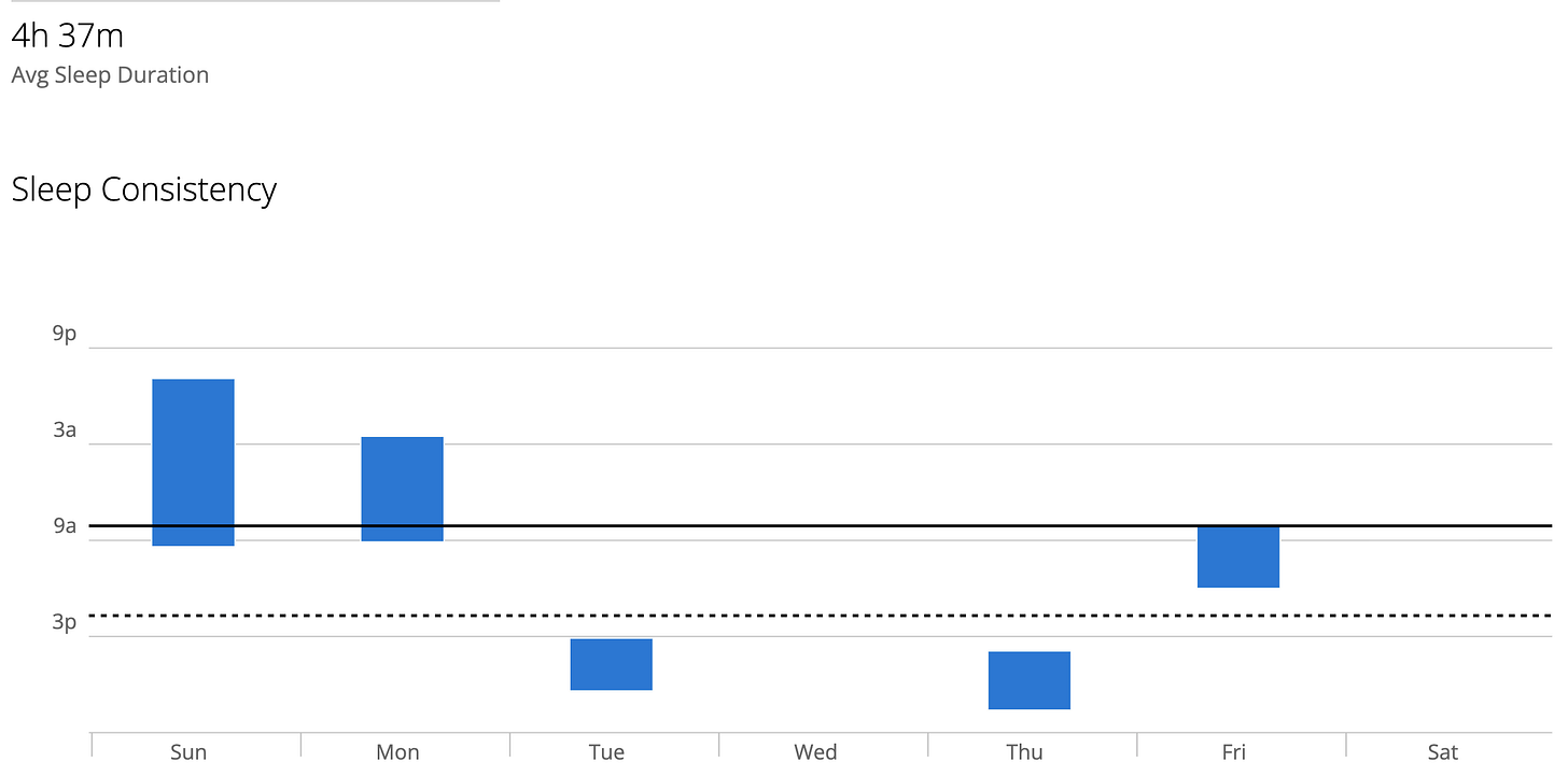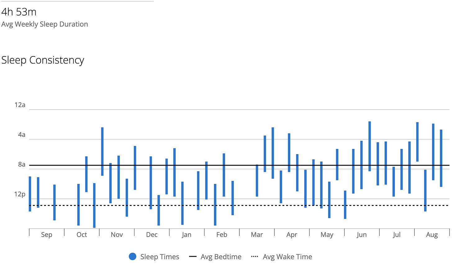 This chart is from my Garmin Fenix 6S and it shows sleep duration and time period for the last twelve months. I had literally no control over my wake/sleep cycle for over a decade. When I was asleep is was fragmented, restless, and that’s why you can see weeks were the machine registered no sleep at all. The overall symptoms matched type 2 narcolepsy for years, but it was always triggered by digestion.
