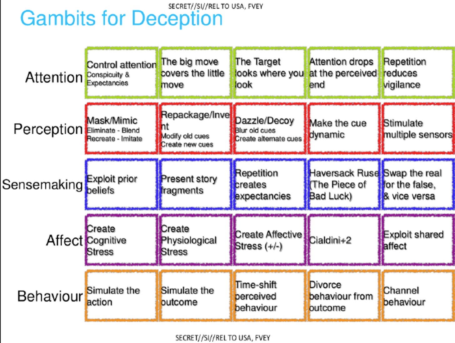 I preach keeping a timeline for those of you who are studying influence operations, that’s been true since the very start of this Substack. You need to be aware of the deception gambits so helpfully described in the JTRIG documents liberated by Edward Snowden. See the ones highlighted in purple?