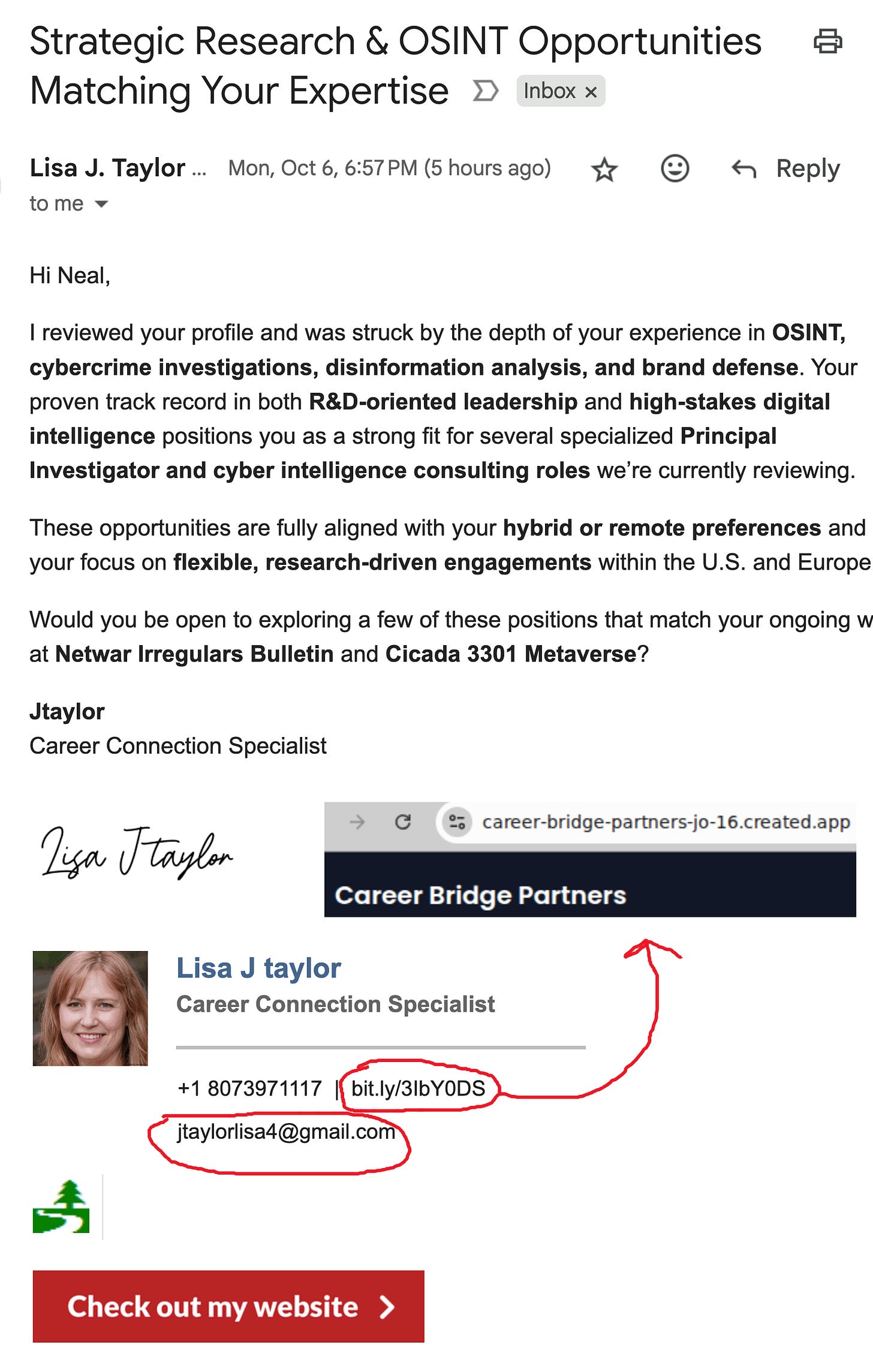 Having poked around a bit, this is probably a broad based effort at … there are a variety of possible motivations. Could be the first step of a fraud and the shaky construction is meant to shake out those who would catch on quickly. Could be a general profiling effort, which I think a lot of LinkedIn bots are, or at least were doing. That’s really slowed down, so maybe this is the first of a wave of plan B.