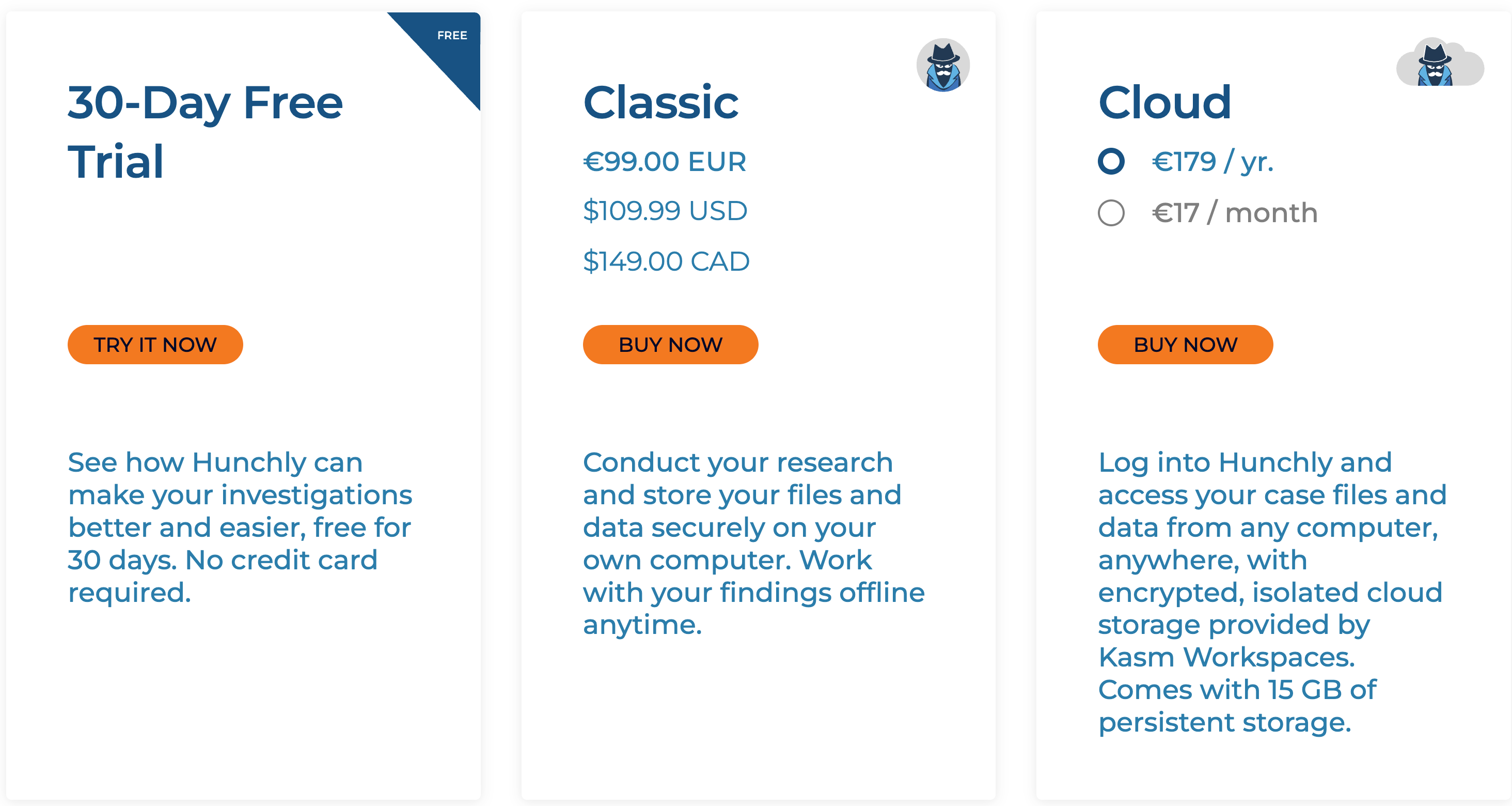 If you’d like to get a lot of Cloak functionality, with Hunchly included, their Cloud offering does that. If you’re really price sensitive you can get Hunchly Classic and put it in a Persona Compartment. And if you just want to poke around, you’ve got a month at no cost.