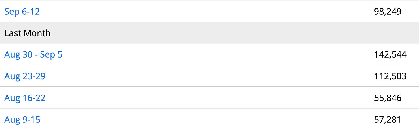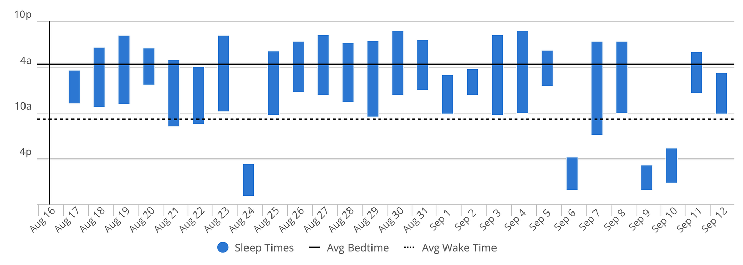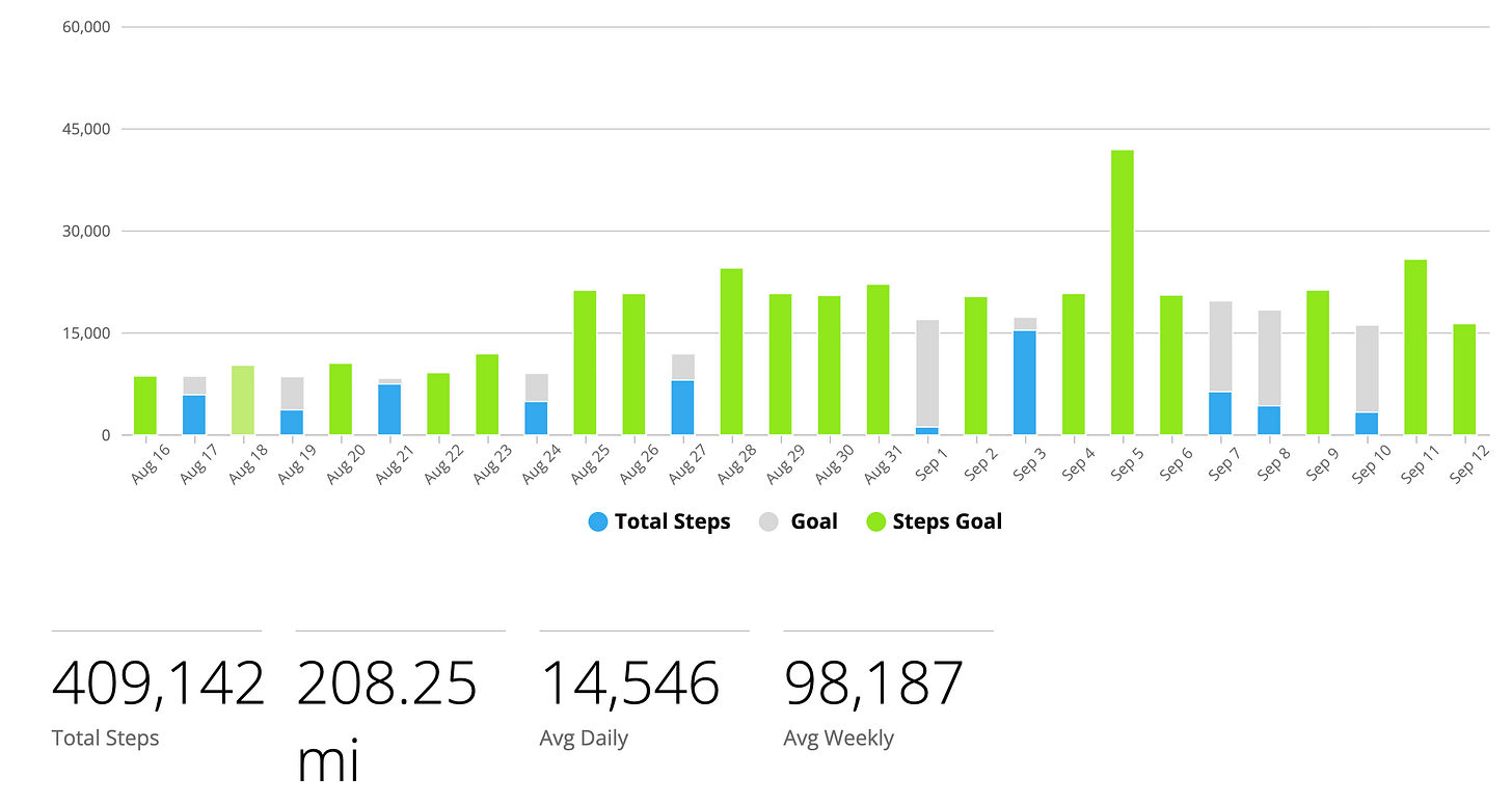 I’m reviewing this on September 12th, a week after I’ve been completely beta blocker free. This is also a week since I started Singulair. The downturn in steps on September 7th can be attributed to getting my flu/COVID19 booster, which troubled me much more than in the past, I think due to my immune system no longer doing a mag dump a couple times a day.