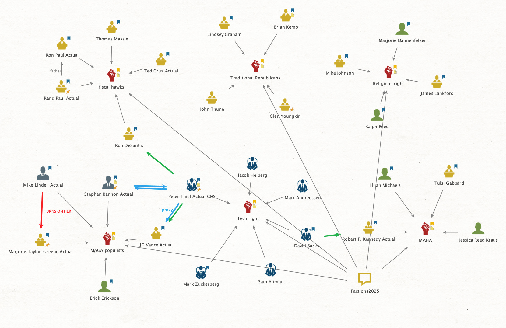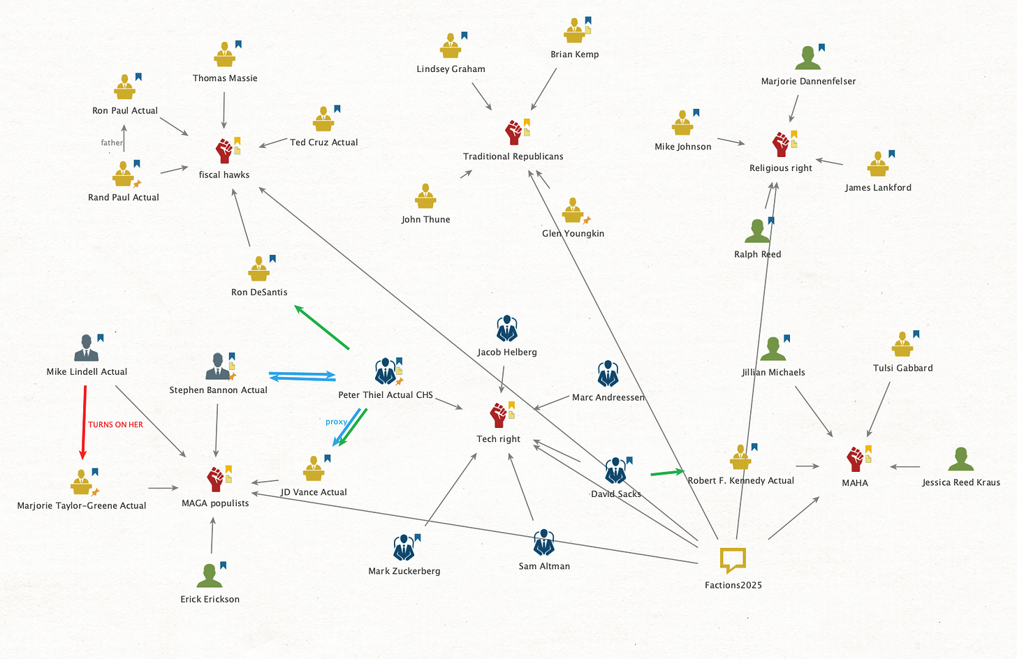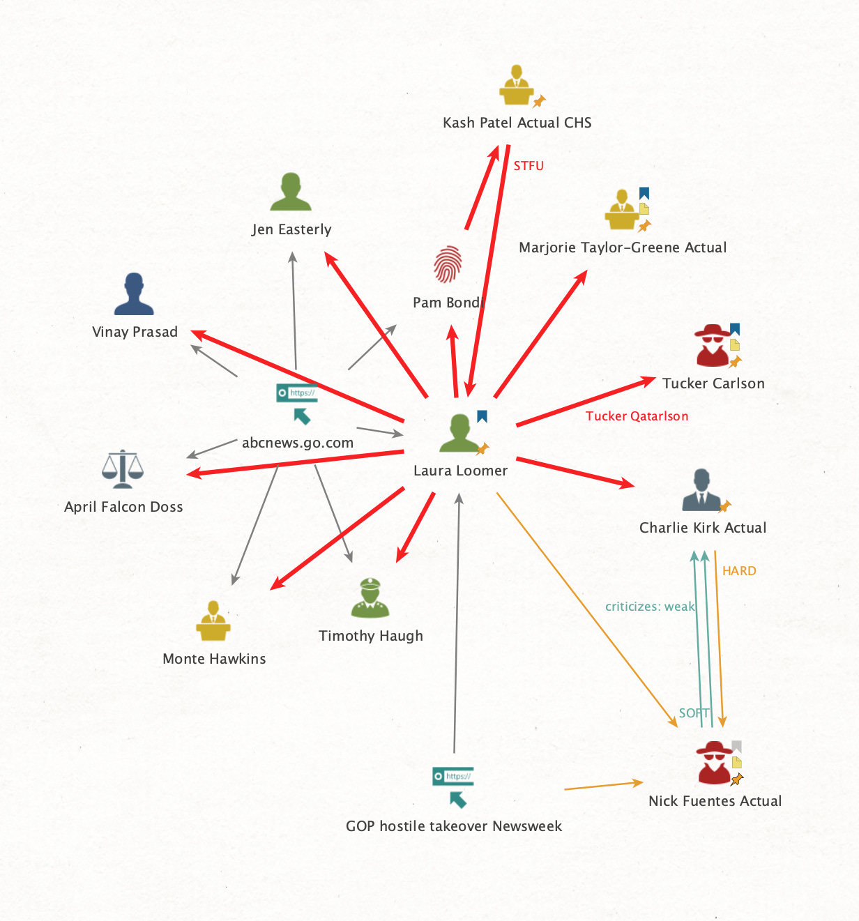 If I were going to spend additional time on this, I would focus on Loomer’s conflicts. The minute Trump is down, those red arrows are all going to reverse.
