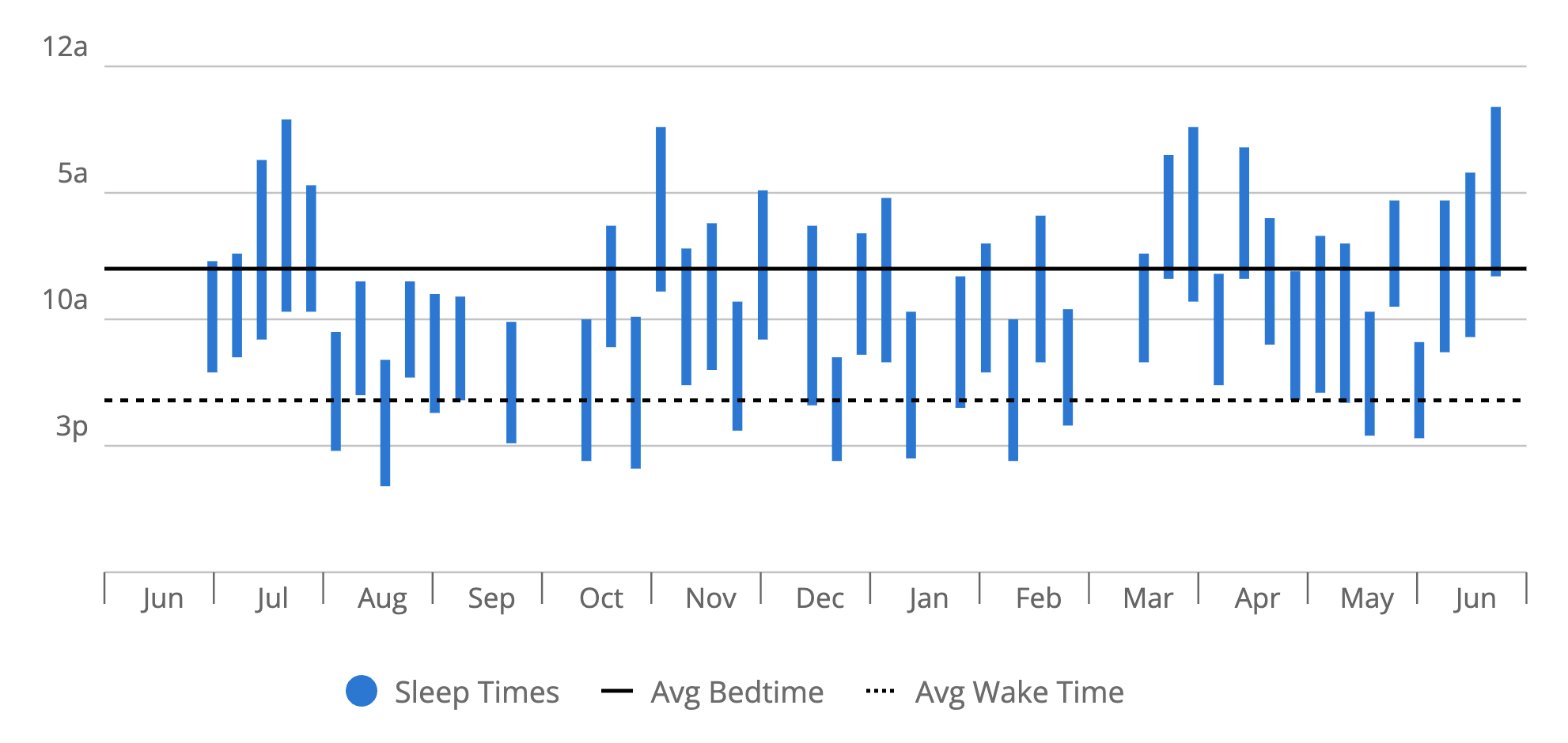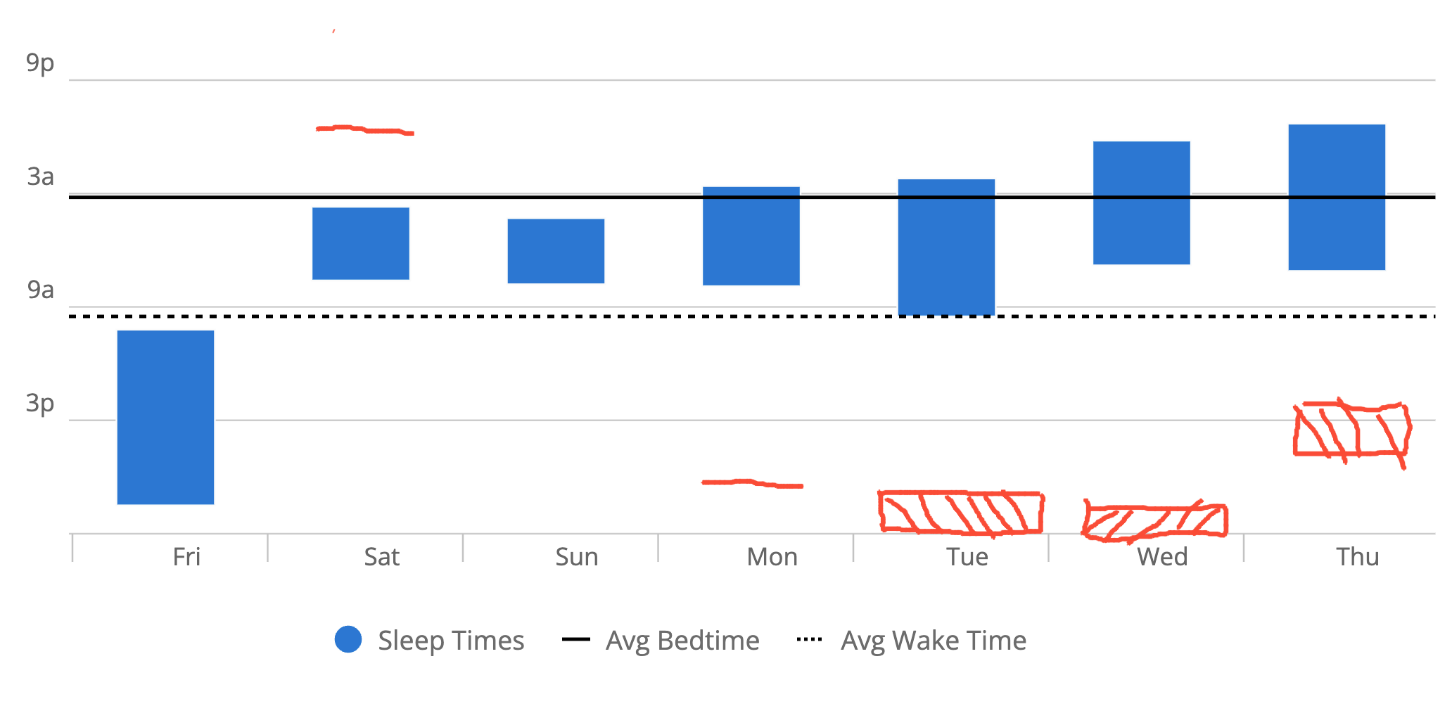 This is what my life has been like in terms of sleep schedule for the last many years - this piece of performance art I have titled UNEMPLOYABLE. I’ve been able to cognitively work like a normal adult since the start of this Substack in August of 2023, but I simply don’t fit anywhere but self employed with this ridiculous schedule I keep.