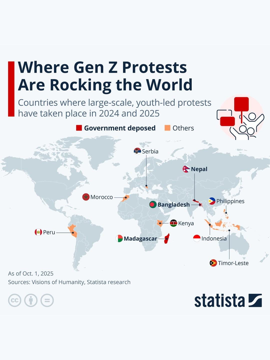 The ten nations affected thus far, Bangladesh, Indonesia, Kenya, Madagascar, Morroco, Nepal, Peru, Serbia, Timor-Leste, and the Philippines are unified … by having extremely online young people. This is not at all like Arab Spring, wherein corruption, cost of living, and a far away climate crisis inflamed North Africa. This is a global phenomena, and I think it’s best summed up as “kids concerned for their future”.
